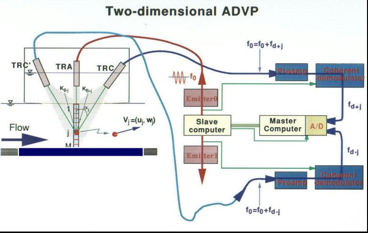4. Acoustic Doppler Velocity Profiling Technology Three acoustic transducers are installed as shown in the figure. The center one is usually a narrow-beam transducer. It transmits a burst of sound pulses with a certain Pulse Repetition Frequency (PRF). The other two are large angle transducers. They receive the ultrasonic wave scattered from suspending particles (or targets) of the water column