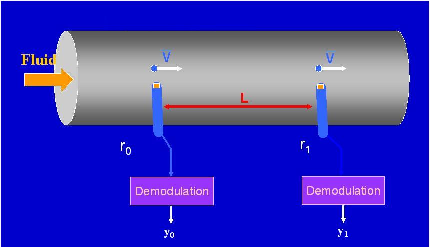 1. Transit-time Technology A typical transit-time ultrasonic flow meter system utilizes two transducers that function as both ultrasonic transmitter and receiver. The flow meter operates by alternately transmitting and receiving a burst of sound energy between the two transducers and measuring the transit time that it takes for sound to travel between the two transducers. The difference in the transit time measured is directly and exactly related to the velocity of the liquid in the pipe. For detailed explanations, please click here. 2. Ultrasonic Doppler Technology Two ultrasonic transducers are employed in the system. One transmits a continuous ultrasonic wave into the flow. Another one is used to receive the ultrasonic wave back scattered from suspending particles (or targets). The received wave has a frequency shift comparing with the transmitted one. This shift is the so-called Doppler frequency shift, proportional to the flow velocity. Therefore, by detecting the Doppler frequency, we are able to derive the flow velocity. The flow rate of a pipe flow is then obtained by computing the product of the velocity and the cross-section area of the pipe. 3. Cross-Correlation Measurement Technology A turbulent flow has a cascade structure of eddies. Along the flow, the characteristics of those structures do not change much within a certain distance, the so-called Correlation Length. In other words, turbulence at a certain distance apart are correlated. Based on this assumption, we can place two pairs of ultrasonic sensors along the flow direction to pick up the turbulence signature. Obviously, the upstream sensor will detect a flow signature L/V seconds earlier than the downstream one, where L is the space between the two sensors and V is the flow velocity. By comparing the signals from the two sensors, we are able to determine the time delay, thus, to calculate the velocity.