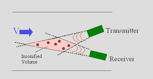 insonified by the transmitting and receiving sound beams. By using pulse-to-pulse algorithm, we are able to obtain the Doppler frequency shift at two directions, from which a 2D velocity profile is formed.